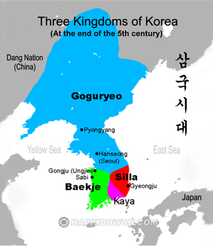 The history of human activity in Korea can be traced far into the Paleolithic period, about 500,000 years ago. The beginning of Korean history is often dated to 2333 B.C. when King Tan-gun, a legendary figure born of the son of Heaven and a woman from a bear-totem tribe, established the first kingdom named Choson, literally meaning the "Land of the Morning Calm." While the historicity of the Tan-gun myth is disputed among scholars, it is known that ancient Korea was characterized by clan communities which combined to form small town-states. They rose and fell so that by the first century B.C., Three Kingdoms, Koguryo (37 B.C. - A.D. 688), Paekche (18 B.C. - A.D. 660) and Shilla (57 B.C. - A.D. 935), had emerged on the Korean Peninsula and part of what is now known as Manchuria.